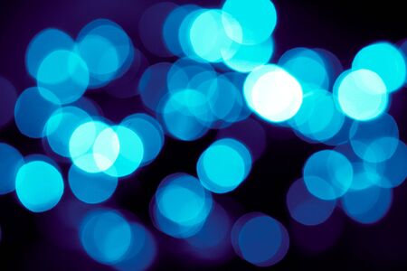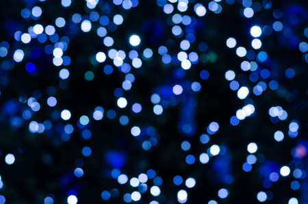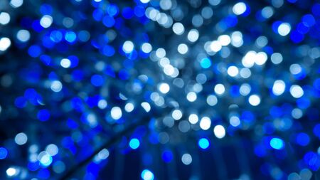 Defocused blue bokeh light of christmas tree at night. Blue bokeh background. Festive colorful backdrop