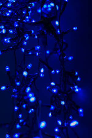 Christmas garland with blue lights on a dark background. For articles about the new year and holiday decorations and houses.