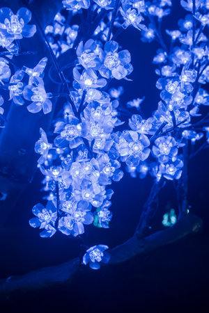 Christmas decoration with blue lights on blooming artificial branch on dark background. holiday concept