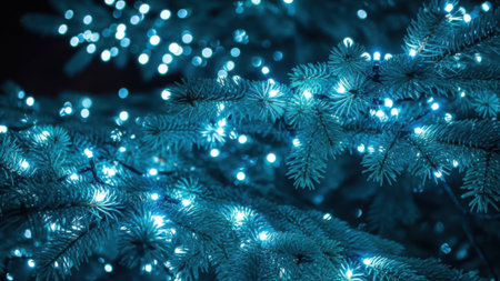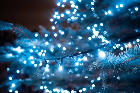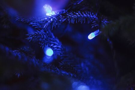 Branches of a Christmas tree spruce with blue garland lights at night. Selective focus. Christmas and New Year concept, banner, greeting card, background. Copy space