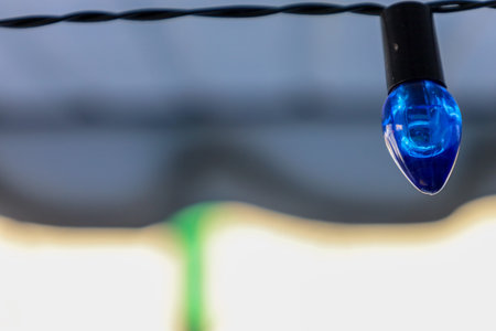 Christmas lights on a blue background with bokeh effect. Christmas background. Closeup view with depth of filed.