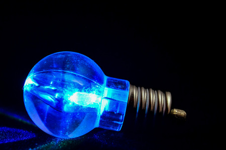 Extinguished electric vintage Edison light bulb with a spiral on a blue background. Retro style lamp.