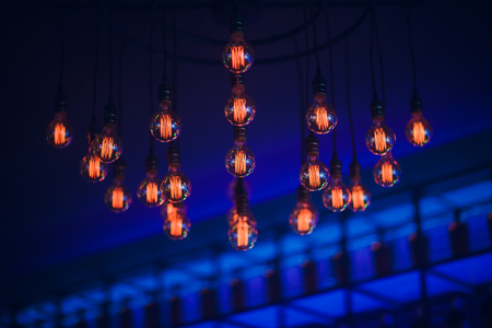 Close-up of glowing fluorescent bulbs suspended from wires on a moody blue-toned backdrop