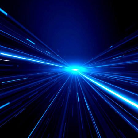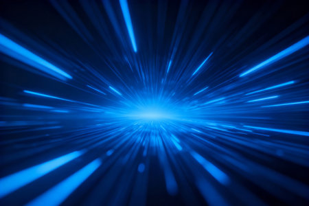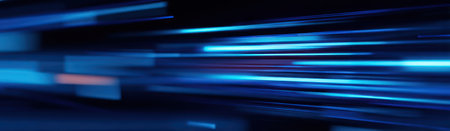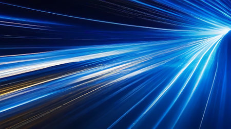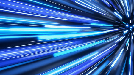Dynamic blue light streaks form an abstract, futuristic tunnel or digital highway, evoking speed, technology, and data flow.