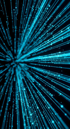 Abstract blue light streaks and particles exploding from a central point in darkness, motion blur effect