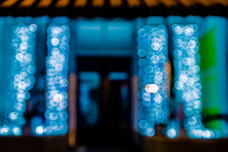 Defocused blue bokeh light of christmas tree at night. Blue bokeh background. Festive colorful backdrop