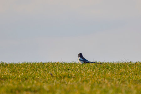 (Pica pica) on a green field looking for food.