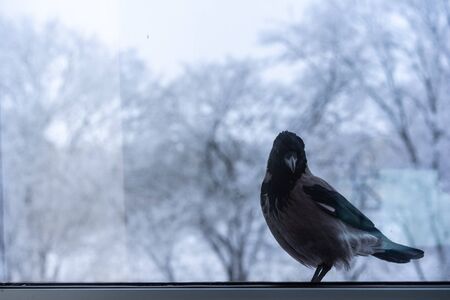 The crow outside the window looks inside.The crow outside the window looks inside