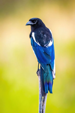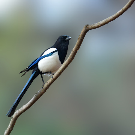 Beautiful Eurasian magpie, European magpie, Common magpie (Cyanopica cyanus) perching on a branch.