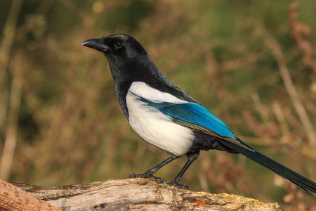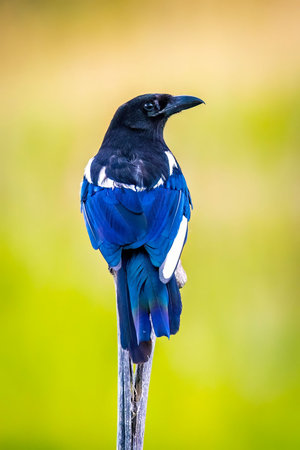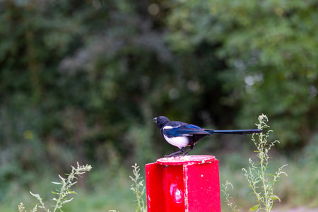 A magpie bird sitting on a tree stump in The Netherlands during summer. Magpie. Schiedam.