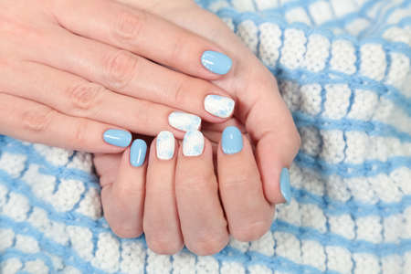 Closeup view of 10 female fingers with painted blue and white nails isolated on cozy warm blanket. Winter style of manicure. Horizontal color photography.