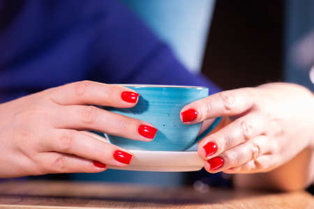 Beautiful woman hands with red manicure and cup Limited depth of field Close-up