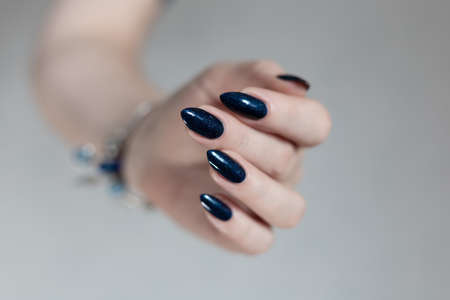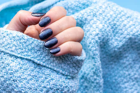 Female hand in knitted sweater fabric with beautiful manicure - dark blue glittered nails on blue background. Selective focus. Closeup view
