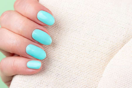 Female hand with beautiful manicure - turquoise, mint blue nails on blue textile fabric background with copy space. Nail care concept