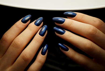 Female hands with long nails with bright blue nail polish