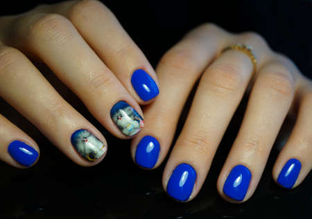 Beautiful female manicure on a blue background. Blue manicure on well-groomed hands.