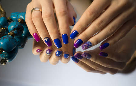 Stylish trendy women's manicure. Blue and lilac color gel Polish. The view from the top. Care. Female hand. Lilac background.