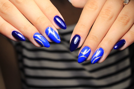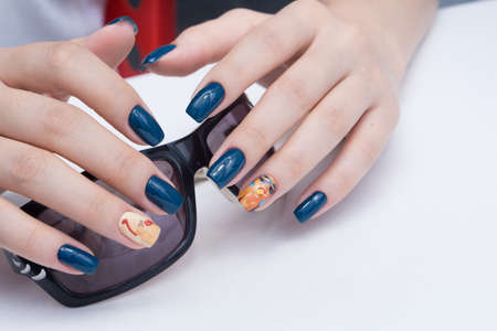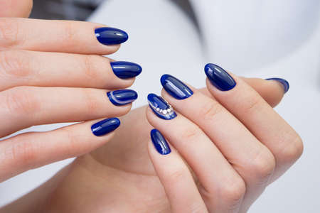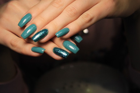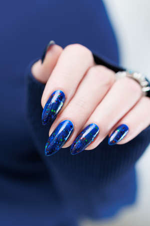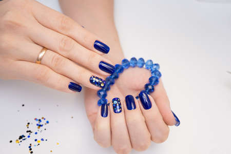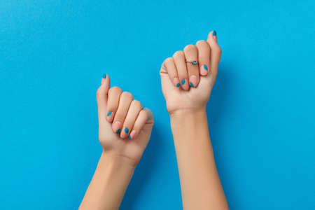 Beautiful summer blue manicure on female hand with nail polish. Close-up. Picture taken in the studio
