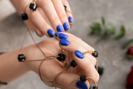 Female hands with beautiful manicure and necklace, closeup