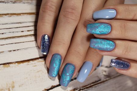 Stylish trendy women's manicure. Blue and lilac color gel Polish. The view from the top. Care. Female hand. Lilac background with sequins.