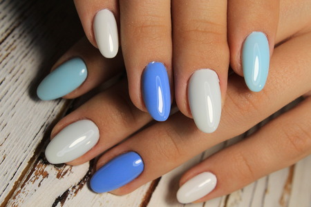 Beautiful female hands with romantic manicure nails, blue and white gel polish