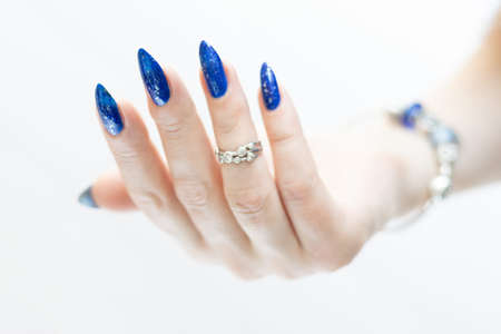 Female hand with blue nail design. Glitter blue nail polish manicure. Woman hand on white fluffy background