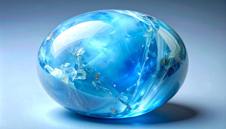 A polished deep blue abstract gemstone orb with swirling patterns and light reflections.