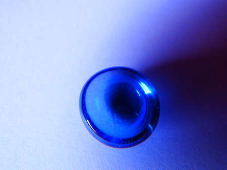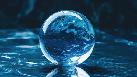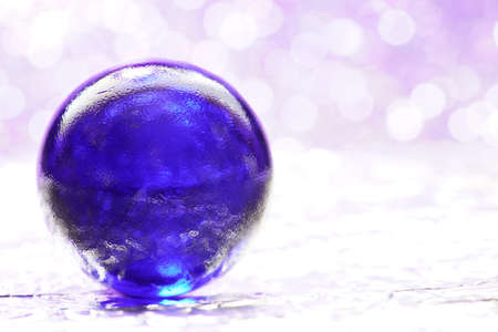 A transparent glass ball on an abstract blue background. The technique of alcoholic ink. Copy space.