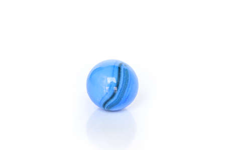 A smooth, marble-patterned blue sphere resting on a white surface, showcasing intricate swirls.