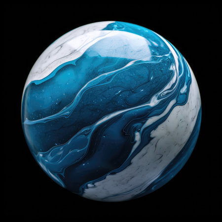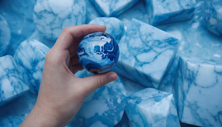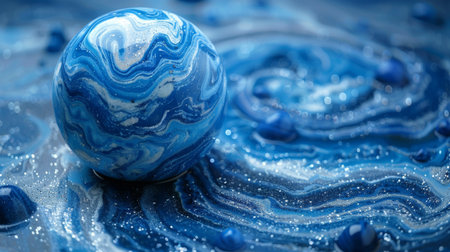 Artistic blue and white marble sphere resting on a bed of glistening white particles, creating a serene scene.