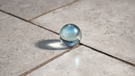 A translucent sphere, possibly a glass globe, sits on a textured surface. The image presents a shallow depth of field, emphasizing the sphere's form. Warm, golden light illuminates the scene, contrasting with cooler blue tones. The composition may be suitable for various commercial projects and editorial uses.