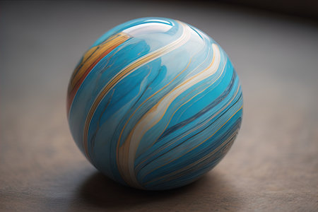 Experience the mesmerizing beauty of this abstract artistic creation. A glass sphere with a captivating marble effect showcases swirling patterns of orange and blue vibrant colors. The reflective surface offers a smooth, glossy finish, creating a stunning visual. This unique and modern design evokes a sense of fluidity and texture, perfect for enhancing backgrounds, designs, and creative projects needing a touch of artistic elegance. Use this colorful and decorative piece to elevate your work.