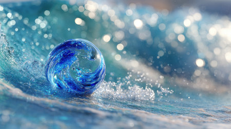 A stunning crystal sphere rolls gently on ocean waves, reflecting sunlight and creating a dreamy atmosphere with bokeh effects in the background.