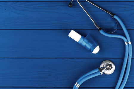 stethoscope for a doctors examination on the background of a medical laboratory health table with space for text. blue background and stethoscope