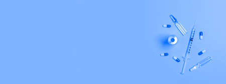 Medical supplies and tools on blue background. Flat lay medical equipment, stethoscope, pills, syringe. Medical banner design, header template. Healthcare and medical concept.