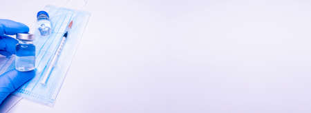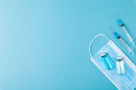 Vaccination medicine mask syringe medicine vitamins in glass vials on a blue blue background with a place to text copyspace.
