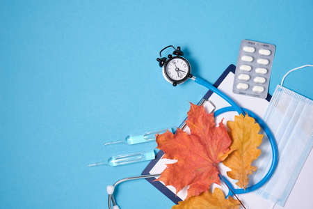 black small alarm clock, medical protective disposable mask and stethoscope and autumn maple leaves on a blue background copy space