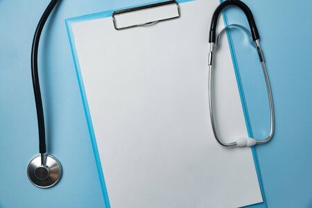 Stethoscope and document on blue background. Blank sheets of paper for your text. Copy space.Mock up.