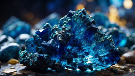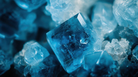 Close-up of vibrant blue crystals texture. Macro photography for design and wallpaper. Geology and mineralogy concept with copy space.