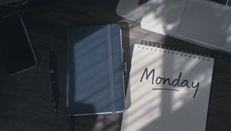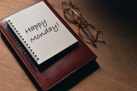 Top angle view of eyeglasses and notebooks written with text HAPPY MONDAY!