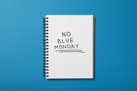 Notepad with text No Blue Monday on blue background, top view