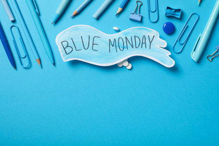 Blue Monday text and stationery on blue background, space for text