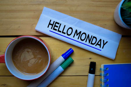 Hello Monday write on the tissue with wooden table background