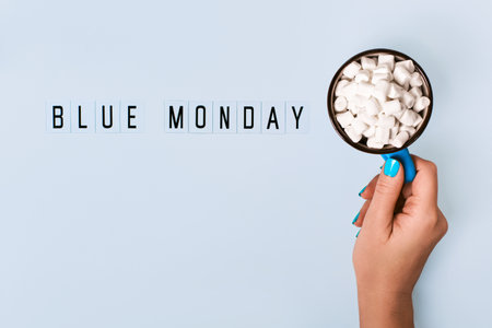 Blue monday text and female hand holds blue mug with cocoa on blue