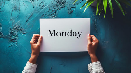 Hands holding white sheet of paper with word Monday on blue background