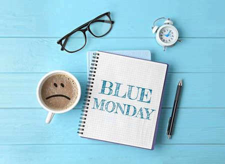 Blue Monday. Flat lay composition with office stationery and cup of coffee on wooden table