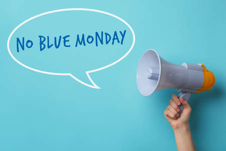 Man holding megaphone and phrase No Blue Monday on turquoise background, closeup