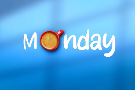 Cup of coffee as letter O in word Monday arranged from print letters on a blue background. Creative minimalist concept.