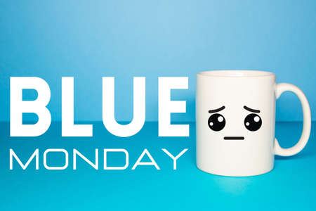 A blue coffee mug with a sad face drawn on it sits on a plain gray background. The phrase 'BLUE MONDAY' is written beside the mug.