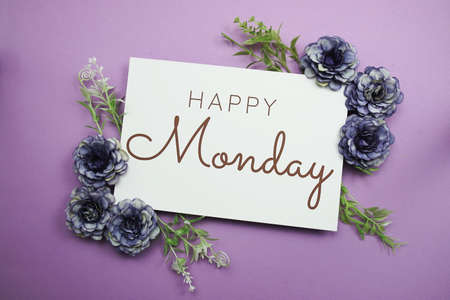 Happy Monday typography text with flowers on purple background